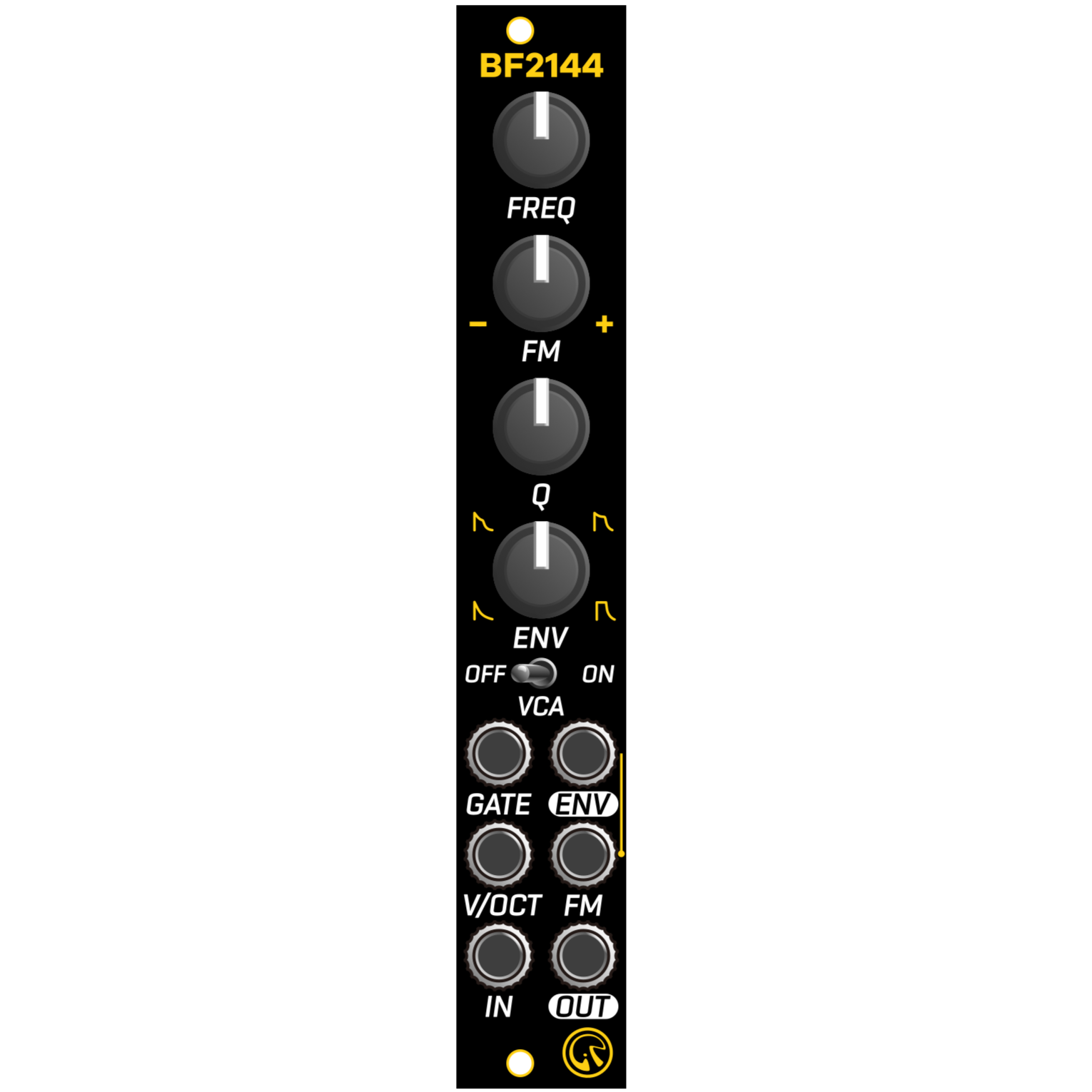 The FM knob acts as an attenuverter. The signal input from the FM input is adjusted by the FM knob and then modulates the cutoff frequency. In addition, the ENV output is internally wired to the FM input. (Patching to the FM input will cut off the internal wiring)